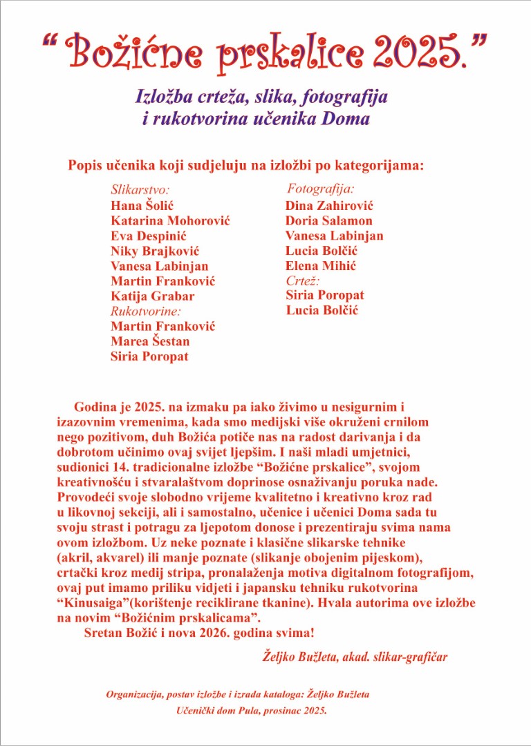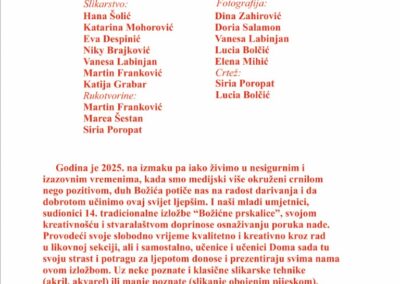 Otvorena je i izložba. “Božićne prskalice 2025.” izložba je crteža, slika, fotografija i rukotvorina kojom se svojim radovima predstavilo 17 učenika, dok organizaciju, postav i izradu kataloga možemo zahvaliti odgajatelju Željku Bužleti, akademskom slikaru i grafičaru koji već tri decenije marljivo vodi i podržava naše likovnjake.